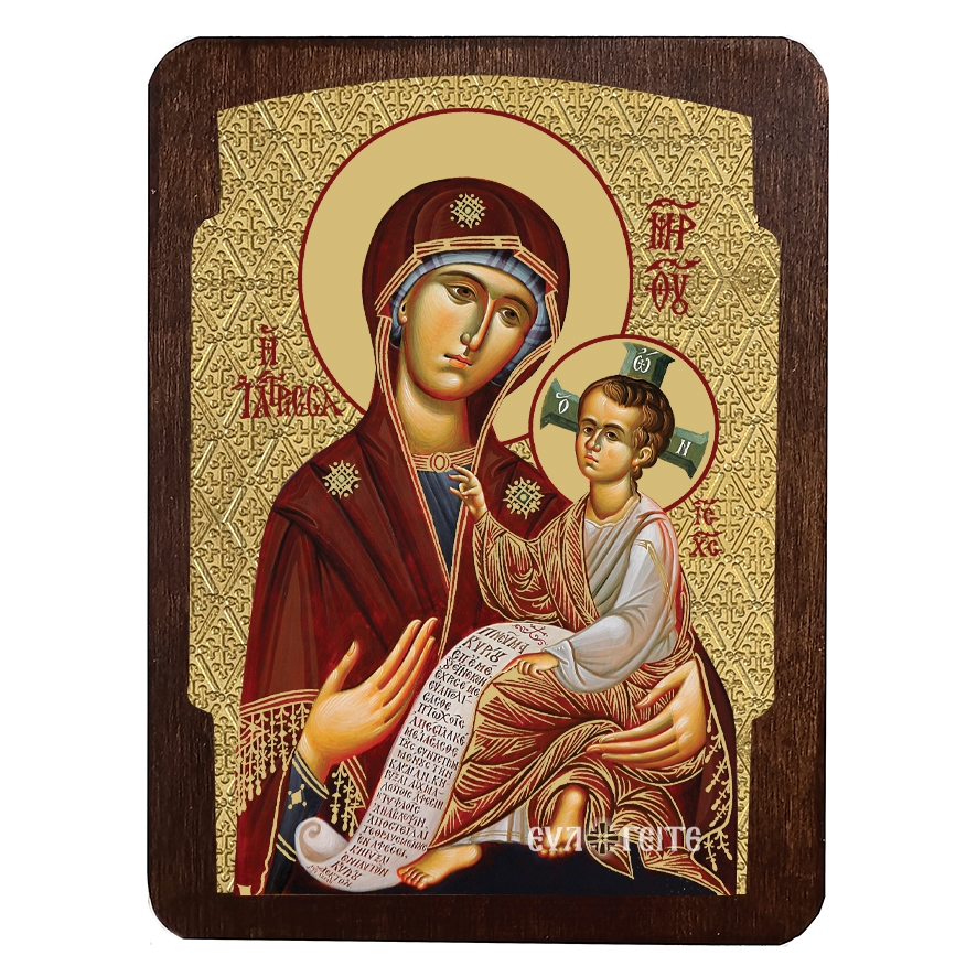 Μοναδική βυζαντινή μεταξοτυπία με φύλλο χρυσού επάνω σε καμβά αγιογραφίας φιλοτεχνημένη με την τεχνική του στιλβωτού τσουκάνικου. Τα υπέροχα χρώματα και τα εκπληκτικά βυζαντινά ανάγλυφα σχέδια παραμένουν αναλλοίωτα στο πέρασμα του χρόνου