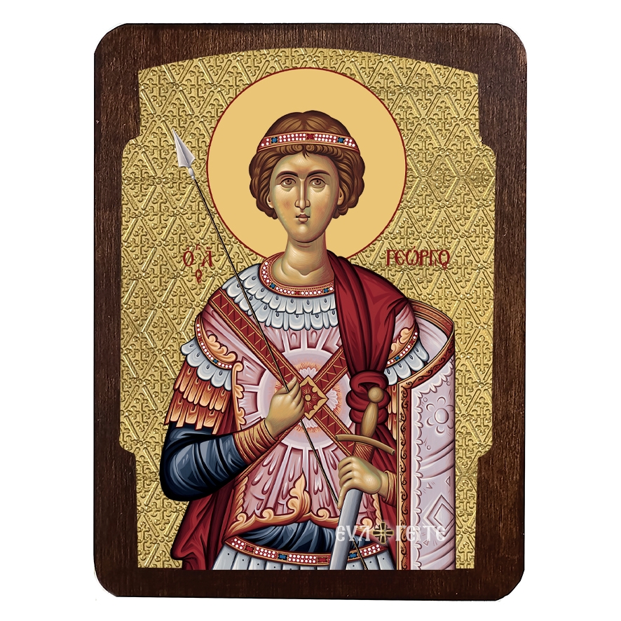 Μοναδική βυζαντινή μεταξοτυπία με φύλλο χρυσού επάνω σε καμβά αγιογραφίας φιλοτεχνημένη με την τεχνική του στιλβωτού τσουκάνικου. Τα υπέροχα χρώματα και τα εκπληκτικά βυζαντινά ανάγλυφα σχέδια παραμένουν αναλλοίωτα στο πέρασμα του χρόνου