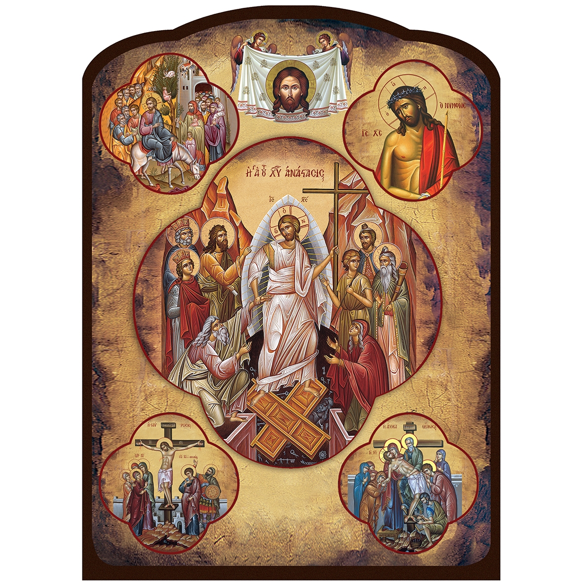Στο κέντρο, ο Αναστημένος Χριστός, νικητής του θανάτου, περιβαλλόμενος από σκηνές της Μεγάλης Εβδομάδας που συγκινούν και εμπνέουν.
